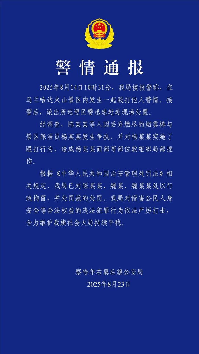 2025年8月14日10时31分,我局接报警称,在乌兰哈达火山景区内发生一起殴打他人警情。接警后,派出所巡逻民警迅速赶赴现场处置。